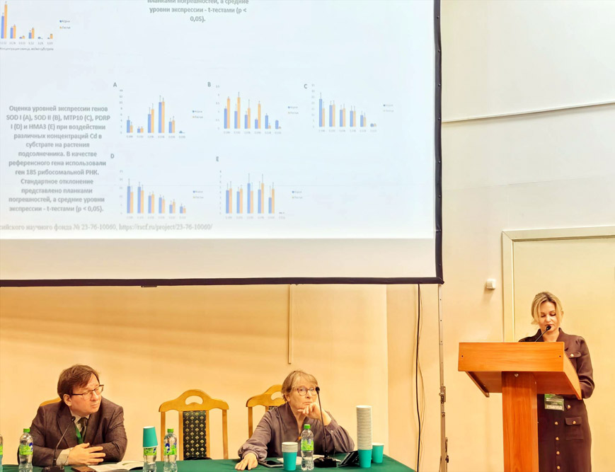 Докладчики представили результаты исследований, направленных на комплексный анализ влияния кадмия и свинца на растения подсолнечника в условиях недостаточного увлажнения, полученных в рамках работ по гранту РНФ № 23-76-10060.