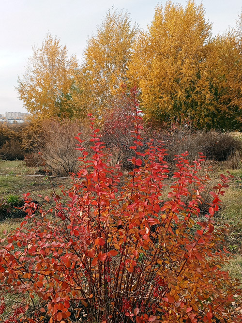 С наступлением осенней поры листья у древесных растений расцвечиваются и приобретают яркий красочный наряд. В это время становятся живописны и завораживают своими бордовыми листьями Sorbus aucuparia L., Amygdalus nana L., алыми — Spiraea ussuriensis Pojark., Cotinus coggygria Scop., желтыми — Larix sibirica Ledeb., Prunus armeniaca L., желто-зелеными — Betula pendula Roth, Salix alba L. f. Pendula. Растения особенно эффектно смотрятся и радуют глаз в последние солнечные и теплые октябрьские дни.